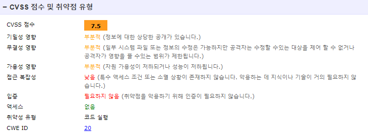CVE-2018-20062 점수 접근 복잡성이 낮아 해킹에 사전지식이 없는 공격자도 인터넷에서 공격구문을 찾아 공격을 할 수 있습니다.